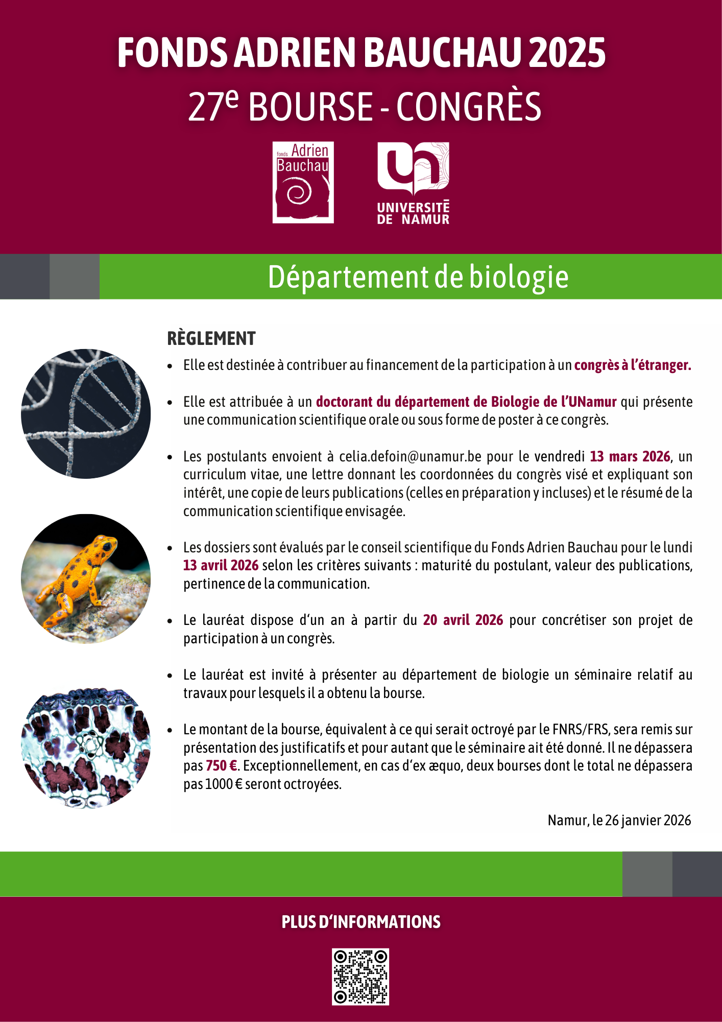 La bourse est destinée à un jeune chercheur pour permettre sa participation à un congrès à l’étranger. Le montant accordé est fonction du coût de cette participation; il peut atteindre 750€. Les dispositions annuelles particulières et les prescriptions à suivre (date, formes d’introduction des candidatures,… ) sont communiquées par voie d’affiche.